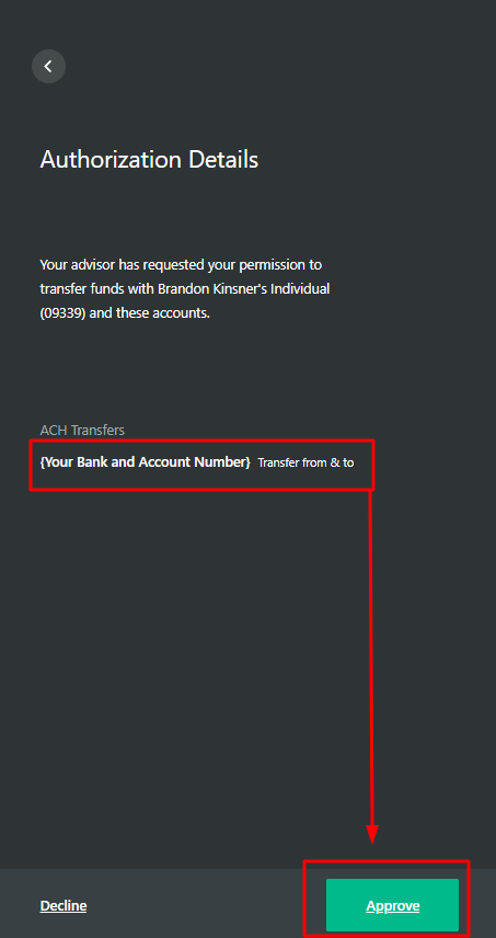 4. A window will slide in from the right and will denote which account(s) your advisor is requesting access to. Please review this section to ensure this is the correct bank you'd like linked. From here select the "Approve" button if all appears well.