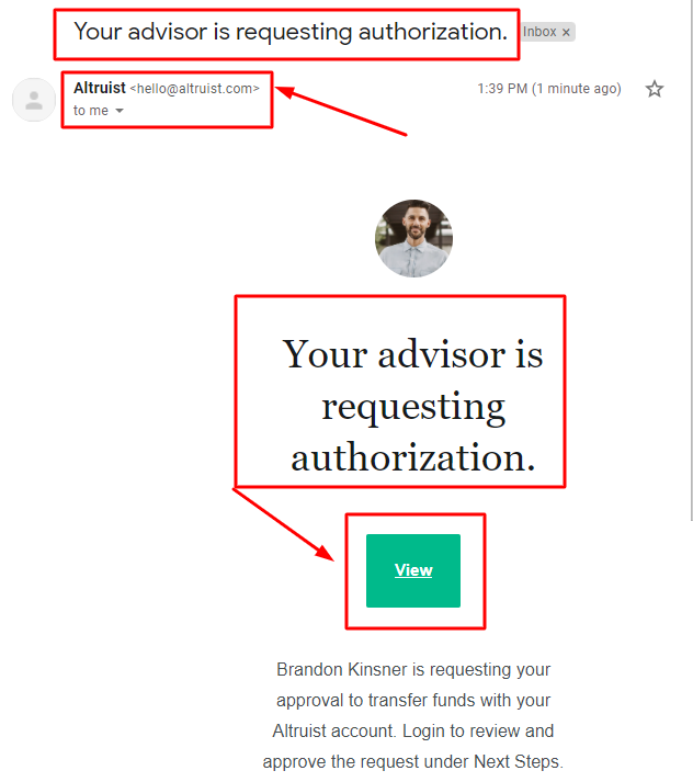 1. Log in to your email provider and find the email sent to you from Altruist - it should look like the screenshot below. Select the "View" button - from here you will be directed to Altruists website to login if you have not already.