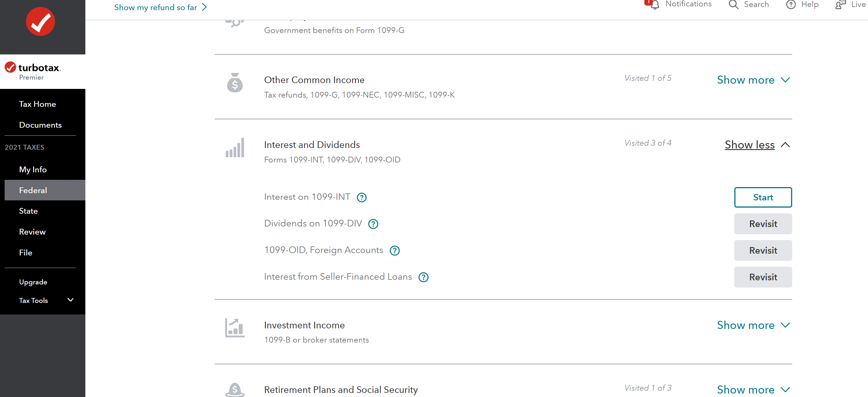 1. Once you log in to your TurboTax profile navigate to the Federal section along the left pane and from here find the 1099r section. For this example, we did not have any 1099r's to use for an example but the 1099-DIV/INT procedure is the same.
