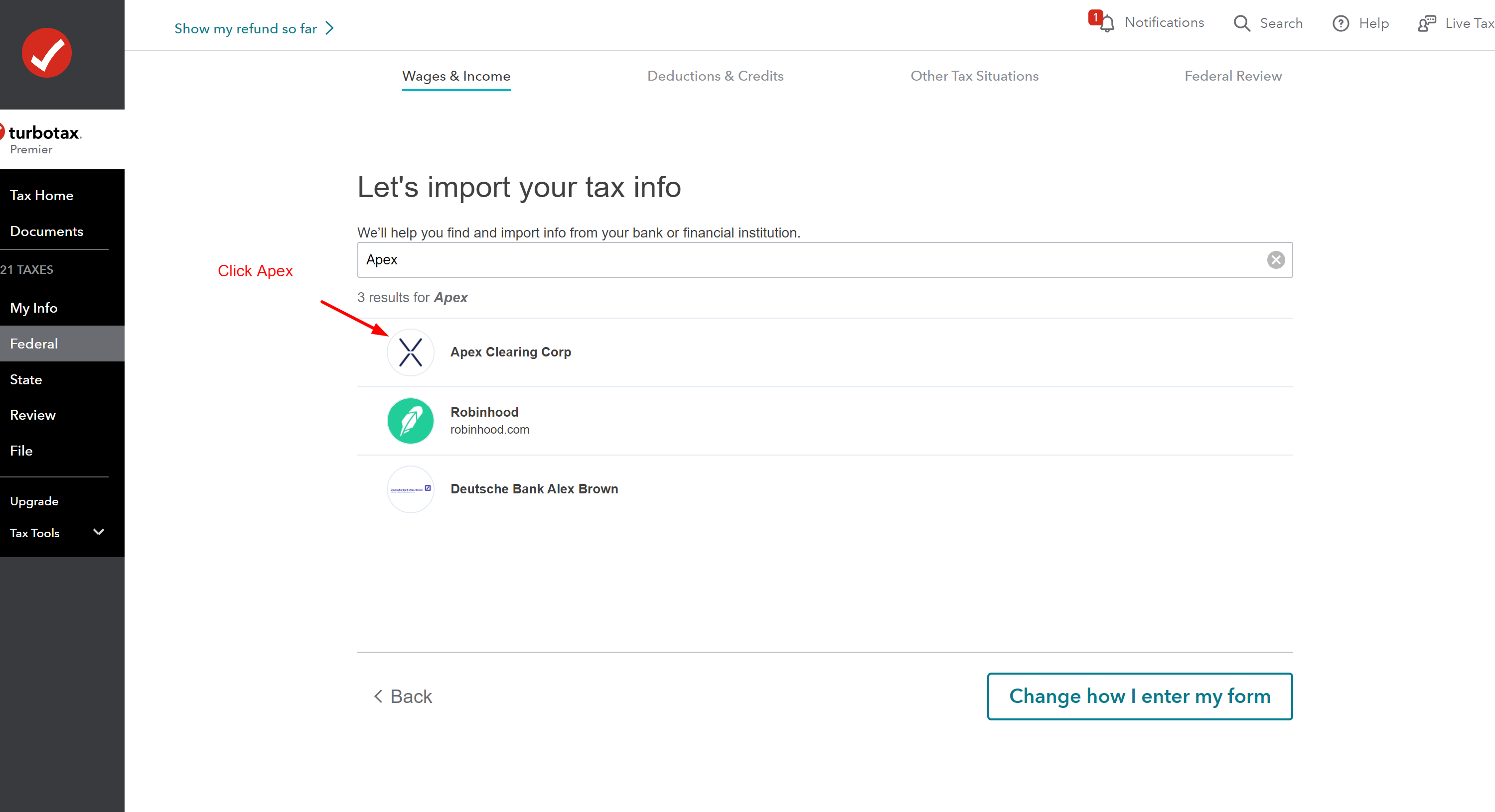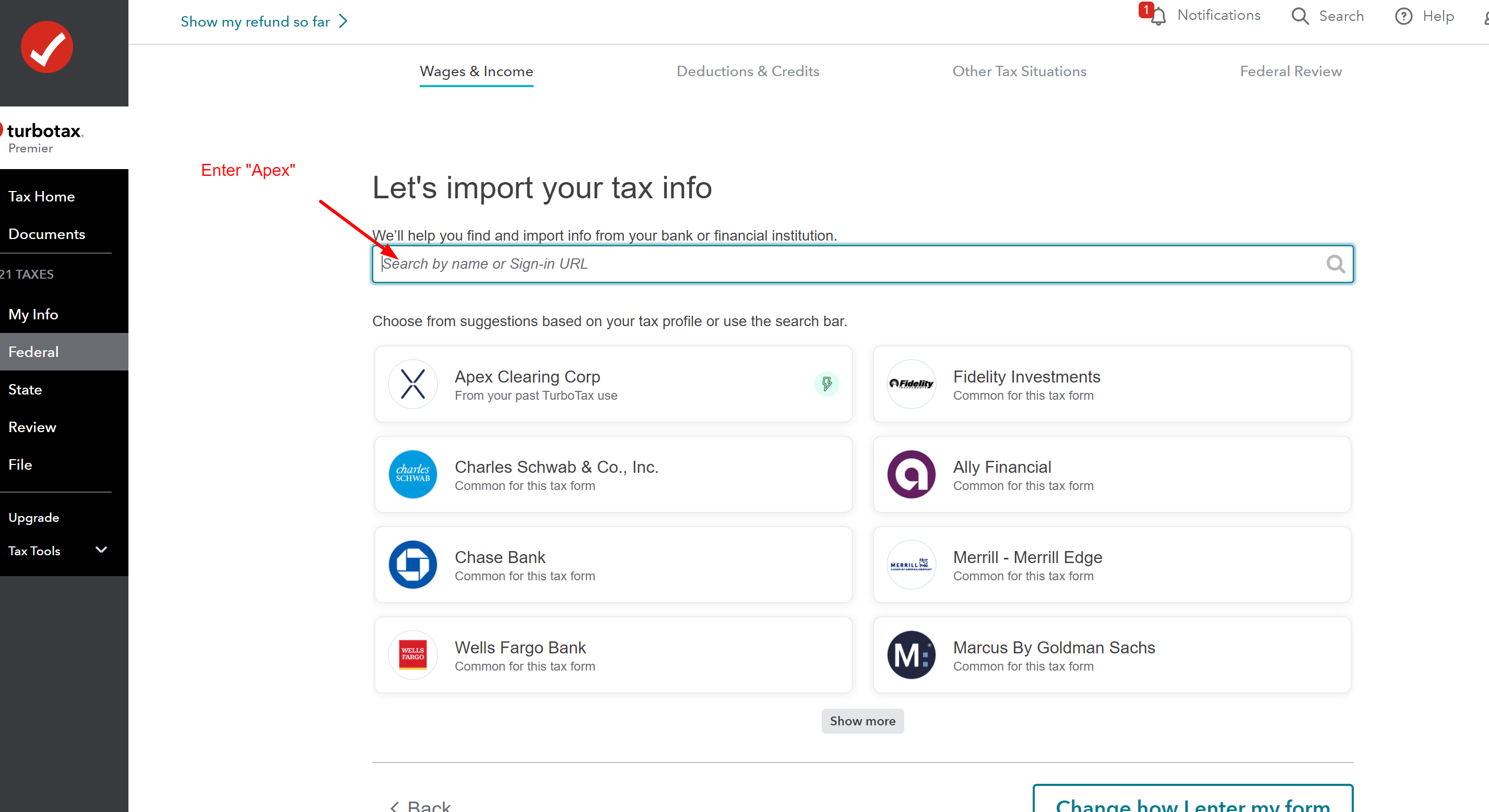 2. Next you'll be prompted to input which custodian you'd like to import your 1099's from - in this case use the search field and type in: "Apex Clearing Corp"