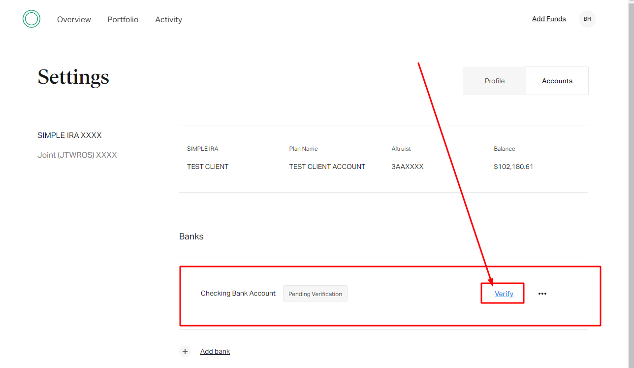 Follow the same linking instructions by entering your routing and account number (see below) and a micro deposit of $00.01 will be made into your bank account by Altruist.