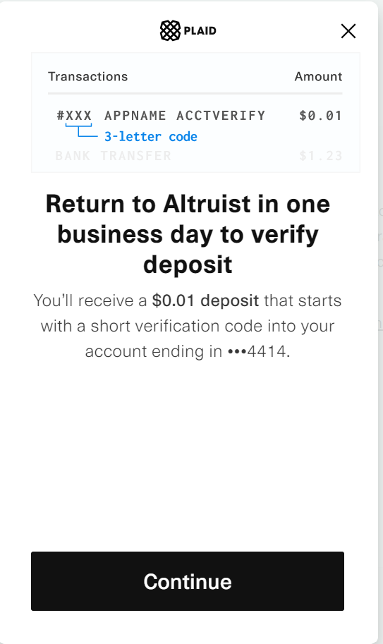 5. Plaid will now launch in the center of your screen, this is where you will enter the 3-digit transaction code associated with the deposit made by Altruist.